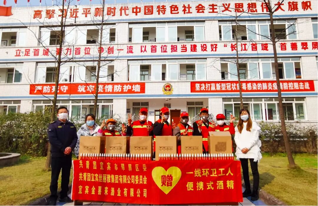 为打赢疫情防控狙击战,2月25日,由共青团宜宾市翠屏区区委、宜宾丝丽雅集团团委、金喜来酒业联合捐赠2000瓶75度酒精已发放给翠屏区一线环卫工作手中,防控不松懈,共同守护一方平安。